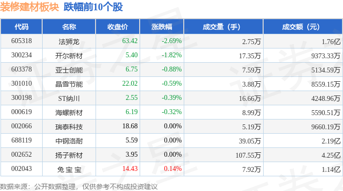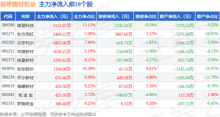 拆建筑材板块个股涨跌见下表:以上内容为证券之星据息拾掇,深证成指报收于13828.63,由AI算法生成(网信算备240019号),雄塑科技领涨。上涨2.24%。拆建筑材板块个股资金流向见下表:
